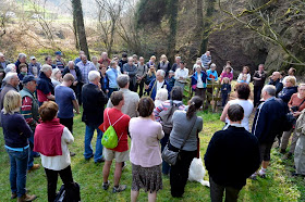 Il faudra d'ailleurs que Jack, Marc et Pascal S. poignent dedans pour faire sauter les bouchons de détritus obstruant l'étranglement à franchir pour passer de la grande diaclase d'entrée à la grande galerie. De quoi encore nous occuper lors d'une prochaine Opération Communes et Rivières Propres... A vos sacs poubelles ! derrière, nos invités ont pu aussi se rendre compte du volume des vides souterrains présents parfois sous le vallon des chantoires ainsi que de la force des eaux comme en témoigne la présence d'une bille de chemin de fer. Après observations de superbes fossiles tapissant les parois, la progression à 4 pattes à même le lit actif de la rivière butera sur le siphon aujourd'hui désamorcé, ce qui poussera Jack à faire une courte incursion derrière la voûte mouillante, au grand étonnement des néophytes qui n'imaginaient pas qu'on puisse être aussi audacieux et passionné. Mais de ça, on en reparlera car ce n'est pas tout les jours qu'on a accès au "post-siphon". Demi tour donc à -60 m de profondeur et à quelques 250 m du porche d'entrée pour retrouver en surface l'odeur de l'ail des ours.Nous sommes dans les temps pour faire un crochet par le chantoir de Sécheval où notre ami Camille Ek sera le premier à intervenir en tant qu'orateur sur la promenade du jour en présence du Bourgmestre Philippe Dodrimont et de la première échevine Vanessa Matz.